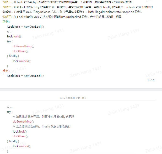 在使用阻塞等待获取锁方式中,必须在try代码块之外,并且在加锁方法与try 代码块之间没有任何可能抛出异常的方法调用,避免加锁成功后,在finally中无法解锁